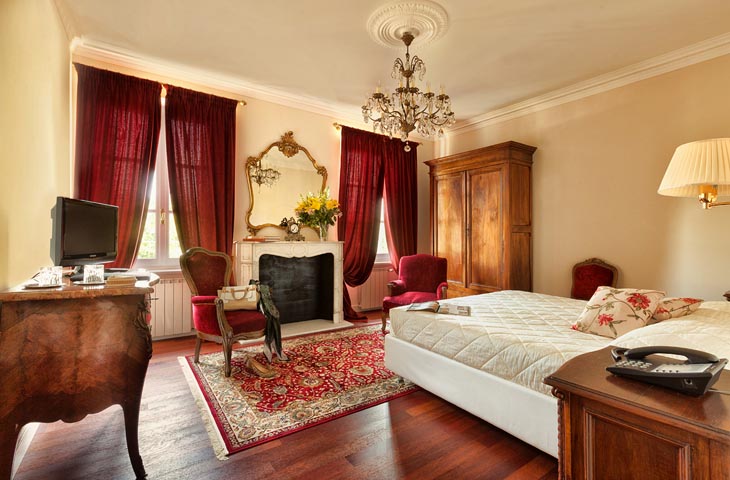 Soltanto 9 camere, tutte diverse, tutte arredate con mobili d’epoca, cercati uno ad uno, di provenienza piemontese o provenzale, in ogni camera un bel caminetto in marmo francese, una comò antico patinato dal tempo, un armadio come quelli della nonna e poi bei tessuti, specchi e soprammobili, stampe, quadri, argenti e cristalli che luccicano senza ridondanza e che danno calore e completano gli ambienti in sintonia con lo stile della casa.
